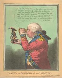 Keywords: James Gillray The King of Brobdingnag and Gulliver.–Vide. Swift's Gulliver- Voyage to Brobdingnag The Metropolitan Museum of Art edit.jpg Brobdingnag and Gulliver Jonathan Swift's Gulliver's Travels Gilray reuses some of his stock characters; George III of the United Kingdom as the King of Brobdingnag and a miniscule General Napoleon in the role of Gulliver Restored from File The King of Brobdingnag and Gulliver “Vide Swift's Gulliver Voyage to Brobdingnag jpg water damage removed slightly straightened despecked 1803-06-26 etching aquatint Institution Metropolitan Museum of Art object history credit line Restored by   ” Chris Woodrich talk 10 53 11 August 2015 UTC accession number Metropolitan Museum of Art online collection http //metmuseum org/collection/the-collection-online/search/391822 entry 391822 PD-old-auto-1923 1815 Image The king of Brobdingnag and Gulliver jpg Assessments 1 The King of Brobdingnag and Gulliver Etchings in the Metropolitan Museum of Art James Gillray Gulliver's Travels Caricatures of Napoleon I of France Caricatures of George III of the United Kingdom Restorations by Chris Woodrich Restorations by Chris Woodrich featured on the English Wikipedia