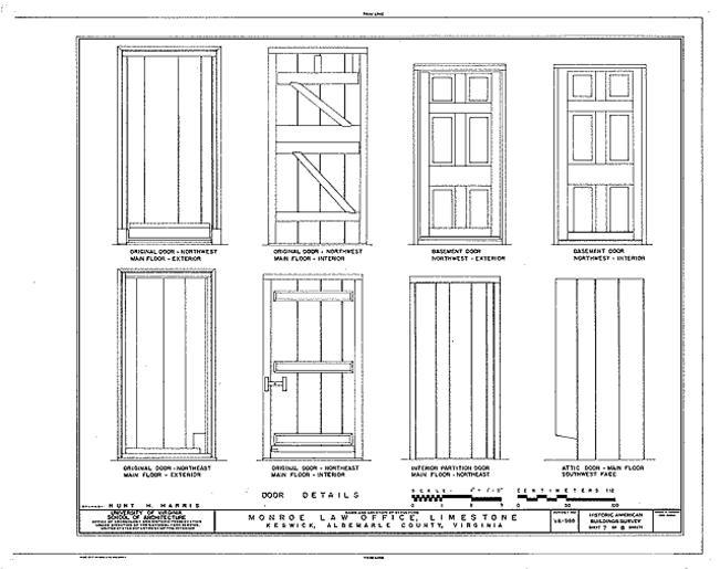 | Keywords: James Monroe Law Office 7a.gif en TITLE Monroe Law Office Limestone Plantation Virginia Route 250 Keswick Albemarle County VA CALL NUMBER HABS VA 2-KESW 1A- REPRODUCTION NUMBER See Call Number MEDIUM Measured Drawing s 8 18 x 24 in Data Page s 10 plus cover page DATE Documentation compiled after 1933 CREATOR Historic American Buildings Survey creator RELATED NAME S Monroe James Jefferson Thomas NOTE Survey number HABS VA-988 Unprocessed field note material exists for this structure FN-280 Building/structure dates 1794 initial construction Significance The Limestone Estate is part of the original Crawford and Lewis patents of 1731 and 1734 Subsequent owners include James Monroe his brother Andrew Thomas Jefferson and Dr George Blaetterman in whose family the property remained until the twentieth century The Monroe Law Office - the oldest residential structure - bears the date 1794 and is known to have been used by both James and Andrew Monroe The Monroe Law Office is a small three bay single pile eighteenth century wood frame structure raised on a high brick basement with a steeply pitched roof Although only one of the two original external ramped chimneys remain and numerous alterations have taken place the Monroe Law Office remains an exemplary eighteenth century Tidewater form transplanted to Piedmont Virginia SUBJECTS VIRGINIA--Albemarle County--Keswick COLLECTION Historic American Buildings Survey Library of Congress REPOSITORY Library of Congress Prints and Photograph Division Washington D C 20540 USA DIGID http //hdl loc gov/loc pnp/hhh va0069 CONTROL VA0069 LOC-image hhh va0069 Historic American Buildings Survey 1933 VA 2-KESW 1A- Higher resolution JPEG uncompressed archival TIFF James Monroe Law office Doors in Virginia |