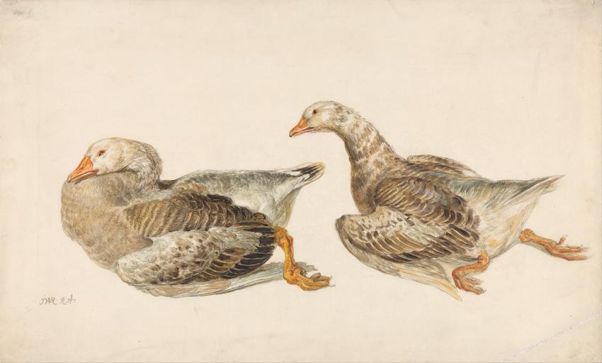 Keywords: James Ward - Studies of Geese - Google Art Project.jpg Inscribed in brown ink lower left JWD RA ; in graphite upper left no 1 Inscription _Signed_and_Dated Signed in brown ink lower left JWD RA Not on View Watercolor and oil over graphite with scratching out on medium smooth cream wove paper birds animals geese animal art nature study special url_id LAHz8yaFkpWN8w PD-old-100-1923 1859 James Ward Google Art Project works by James Ward Drawings of birds |
