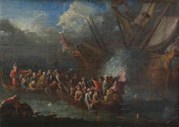 Keywords: Jan Baptist van der Meiren - Sailors escaping from a burning ship.jpg Artwork creator Jan Baptist van der Meiren en Sailors escaping from a burning ship 1679 - 1736 https //www bonhams com/auctions/11912/lot/130/ oil canvas cm 18 7 26 5 Sold at Bonhams on 6 July 2005 in London lot 130 PD-old-100 Jan Baptist van der Meiren Paintings of ships in distress |