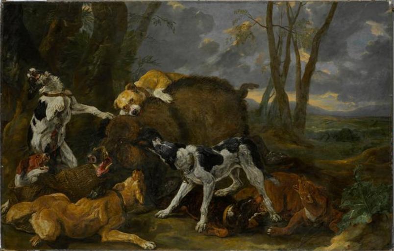 Keywords: Jan Fyt - Boar hunt.jpg Artwork Creator Jan Fyt 17th century Oil on canvas size cm 193 305 Institution Gemäldegalerie Berlin object history credit line accession number Inv -No 259 http //www photo rmn fr/archive/09-523527-2C6NU09CECEC html PD-old-100 Paintings of live animals by Joannes Fijt Flemish Baroque paintings in the Gemäldegalerie Berlin Paintings of boars Boar hunting in art |