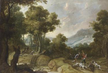 | Keywords: Jan Wildens and Cornelis de Wael - A forest landscape with hunters and their dogs attacking a wolf.jpeg Artwork Creator Jan Wildens Creator Cornelis de Wael en A forest landscape with hunters and their dogs attacking a wolf 1602-1653 https //www bonhams com/auctions/14305/lot/72/ oil canvas Size cm 169 117 object history exhibition history credit line Indistinctly signed `JAN WIL ` lower left Sold at Bonhams on 5 July 2006 in London lot 72<br> The landscape painted by Jan Wildens and the figures by Cornelis de Wael Source https //rkd nl/explore/images/52109 RKD accession number place of creation PD-old-100 Cornelis de Wael Jan Wildens Paintings by two artists Paintings of wolf hunting Images from Bonhams |