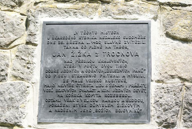 | Keywords: Jan Žižka memorial 08.JPG en Žižka memorial at the Battle of Sudoměř area near Sudoměř village Strakonice district Czech Republic cs Památník Jana Žižky v areálu bitvy u Sudoměře okres Strakonice Text na bronzové desce V těchto místech u Škaredého rybníka nedaleko Sudoměře dne 25 března l 1420 slavně zvítězil táhna od Plzně na Tábor Jan Žižka z Trocnova nad přesilou královských kteří v počtu dvou tisíc dobře jízdných a oděných železných pánů od Písku i Strakonic přitáhli a myslili že malé vojsko husitské majíc nejvýše čtyřista lidu s ženami i práčaty vozů bojovných dvanáct a koní jízdných devět na koňská kopyta rozeberou Odtáhli však s velikou hanbou a škodou poraženi byvše důmyslem Žižkovým a nadšením jeho Božích bojovníků own 2012-06-29 11 10 09 Feťour Žižka memorial Sudoměř |