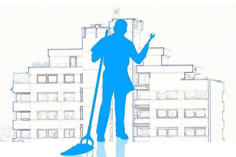 Keywords: janitor cleaning mop clean wrench skyscraper home property managers wait concierge caretaker