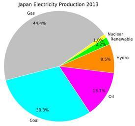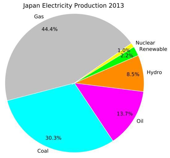 Keywords: Japan Electricity Production 2013.svg en This pie graph shows Japan's energy production in 2013 by percent of national production Data is drawn from a 2014 report by the Ministry of Economy Trade Industry http //www enecho meti go jp/about/pamphlet/pdf/energy_in_japan2014 pdf 日 のエネルギー2014 The Ministry of Economy Trade Industry sometimes divides oil-derived fuels and natural gas in different ways so if you see other numbers for 2013 that differ only in those categories it's not a mistake in the numbers it's a slightly different categorization 2015-12-01 own Douglas Perkins other versions cc-zero Energy in Japan Uploaded with UploadWizard |