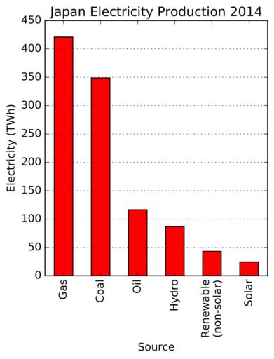 | Keywords: Japan Electricity Production 2014.svg en A line graph showing Japan's energy production by type in 2014 Data taken from the https //www iea org/statistics/statisticssearch/report/ year 2014 country JAPAN product ElectricityandHeat International Energy Agency 2016-11-19 own Douglas Perkins other versions The SVG file was produced using MatPlotLib with the following also Public Domain code <pre> /usr/bin/env python from matplotlib import pyplot from matplotlib import ticker from matplotlib import numpy This generates a bar graph showing Japan's electricity production in 2014 Data from a Ministry of Economy Trade and Industry report https //tinyurl com/japan2014energy This file was written by Douglas Perkins It is released under a Creative Commons Zero 1 0 license https //creativecommons org/publicdomain/zero/1 0/ Renewable energy production in TWh biofuels 28 928 waste 6 595 geothermal 2 577 wind 5 038 renewable biofuels + waste + geothermal + wind Energy production in TWh data Gas 420 825 Coal 348 830 Oil 116 435 Hydro 86 942 Renewable\n non-solar renewable Solar 24 506 sources d0 for d in data amounts d1 for d in data A formatter to display comma-separated numbers on the y axis def comma_func x pos s ' 0 d ' format int x return s comma_format ticker FuncFormatter comma_func Make a bar graph x numpy arange len sources + 0 25 width 0 5 pyplot figure num 1 figsize 4 5 5 pyplot title Japan Electricity Production 2014 pyplot bar x amounts width color 'r' pyplot xlabel 'Source' pyplot ylabel 'Electricity TWh ' yticks pyplot xticks x + width/2 0 sources pyplot xticks rotation 'vertical' pyplot subplot 111 yaxis set_major_formatter comma_format pyplot subplot 111 grid b True axis 'y' pyplot savefig 'Chapter 7 Japan Electricity Production 2014 svg' format 'svg' bbox_inches 'tight' </pre> cc-zero Energy in Japan |