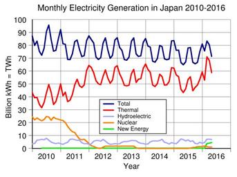 Keywords: Japan monthly electric generation.svg translate yes en Japan monthly electricity generation New energy or renewable is wind solar and geothermal Source is Japan's http //www fepc or jp/library/data/hatsujuden/index html FEPC http //www fepc or jp/english/news/generated_purchased/ English https //www iea org/statistics/monthlystatistics/monthlyelectricitystatistics/ IEA own Delphi234 2016-05-22 current monthly Generated with Wikimedia SVG Chart 1 s Cc-zero Electricity in Japan |