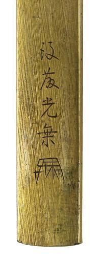 Keywords: Japanese - Blade - Sword and Dragon - Walters 5112204 - Mark A.jpg This iconography of a dragon wrapped around a sword represents Kôbô Daishi's sword Kôbô Daishi also known as Kûkai; 774-834 was a Buddhist priest who studied in China and founded the Shingon sect of Buddhism in Japan It is said he used a sword that had a rain dragon wrapped around it to bring rain at the end of a drought The signature on the back is a forgery of an earlier artist's signature This is part of a mounted set century 19 Edo-Meiji shakudo gold steel cm 21 3 accession number 51 1220 4 36783 Henry Walters Baltimore date and mode of acquistion unknown Walters Art Museum Henry Walters Acquired by Henry Walters Signature Forged Gotô Kôjô kao place of origin Japan Walters Art Museum license Tosogu Japanese sword fittings in the Walters Art Museum White background Media contributed by the Walters Art Museum needs category review Media contributed by the Walters Art Museum needs artist review