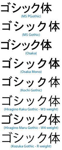 Keywords: Japanese gothic typeface comparison.png A comparison of common en Japanese gothic typefaces MS Gothic and MS PGothic are distributed by en Microsoft with its Windows Operating System Osaka is distributed by Apple with en Mac OS X Kochi Gothic is included with many en Linux distributions Hiragino Kaku Gothic Hiragino Maru Gothic and Kozuka Gothic are distributed by Adobe These fonts come in multiple weights with both lighter and bolder versions than those shown Created with en FontExplorer X and en Adobe Photoshop on an en Apple Macintosh running OS X 10 4 Tiger Released into the public domain In Japanese MS Gothic と MS PGothic は Microsoft が提供している書体 Osaka は Apple Computer が提供している書体 風ゴシック は Linux の多くで配布されている書体 ヒラギノ角ゴシック ヒラギノ丸ゴシック 小塚ゴシックは Adobe Systems が提供している書体 en wikipedia 2006-01-18 Jacobolus wikipedia en original upload log page en wikipedia Japanese_gothic_typeface_comparison png 2006-01-18 03 26 Jacobolus 623×1500×8 36686 bytes <nowiki>A comparison of common Japanese gothic typefaces MS Gothic and MS PGothic are distributed by Microsoft with its Windows Operating System Osaka is distributed by Apple with Mac OS X Kochi Gothic is in</nowiki> text Japanese typeface samples Blackletter |