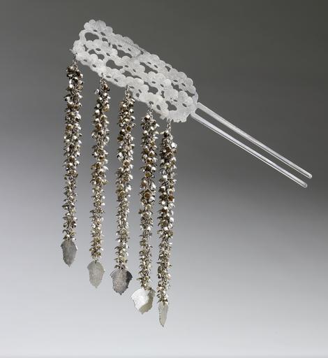 | Keywords: Japanese - Hair Ornament - Walters 571341 - View A.jpg Perhaps designed to decorate the complex hairstyle of a geisha this dangling piece would lend a sparkling bit of movement to the rigid hairstyle of a young woman as she danced or sang traditional folksongs Geisha and their younger apprentices maiko continue to dress each evening in elaborate silk kimono stark white face paint and grandly jeweled hairdos or wigs in order to entertain high-paying restaurant customers in Kyoto and other metropolitan Japanese cities century 19 silver gold cm 20 8 accession number 57 1341 35517 Henry Walters Baltimore date and mode of acquisition unknown Walters Art Museum Henry Walters Acquired by Henry Walters none Bedazzled 5 000 Years of Jewelry from the Walters Art Museum Frist Center for the Visual Arts Nashville; The John and Mable Ringling Museum of Art Sarasota; The Walters Art Museum Baltimore 2006-2009 place of origin Japan Walters Art Museum license Art of Japan in the Walters Art Museum Jewellery in the Walters Art Museum Media contributed by the Walters Art Museum needs category review Kanzashi |