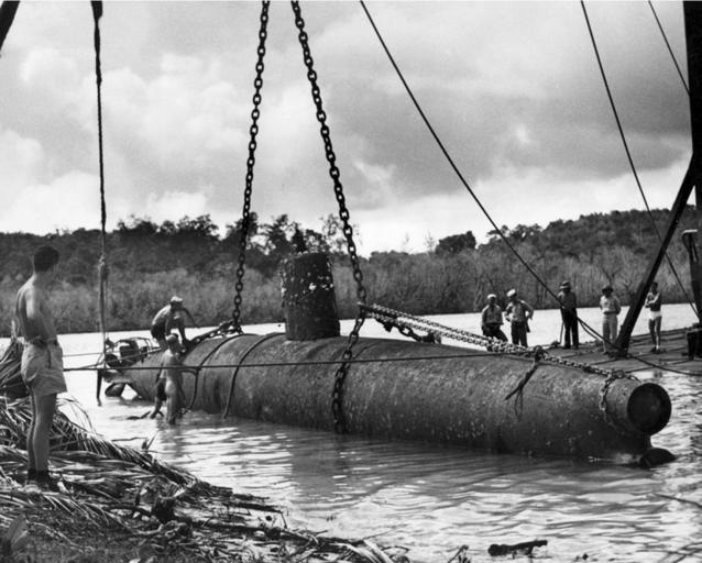 Keywords: Japanese Ko-hyoteki class submarine raised at Guadalcanal 1945.jpg A Japanese Ko-hyoteki-class submarine raised off Cape Esperance Guadalcanal by the U S Coast Guard buoy tender USCGC Ironwood WAGL-297 in January 1945 The submarine was raised in about 10 metres of water on 20 January towed to Hutchinsons's Creek Florida Island and transferred to a crane barge on the following day LOC-image HAER AK-44-2 http //hdl loc gov/loc pnp/hhh ak0506/photos 193651p http //www uscg mil/history/webcutters/Ironwood_1943 pdf 1945-01 USCG frame removed PD-USGov Ko-hyoteki class submarine Guadalcanal Campaign |