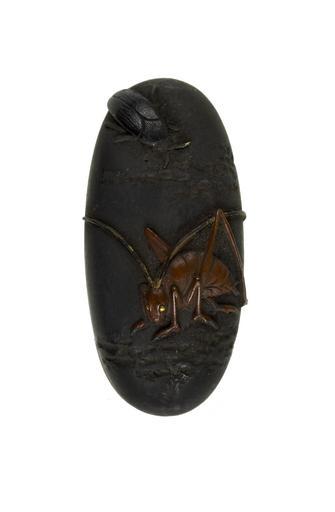 | Keywords: Japanese - Kojiri with Cricket and Cockroach - Walters 511135.jpg At the top is a cockroach with a beetle on the bottom The background is designed to look like tree bark The two insects appear to be crawling along the trunk of a tree century 18 19 silver copper gold cm 2 5 accession number 51 1135 30476 William T / Henry Walters Collection Baltimore date and mode of acquisition unknown Walters Art Museum Henry Walters Acquired by William T or Henry Walters none place of origin Japan Walters Art Museum license Tosogu Japanese sword fittings in the Walters Art Museum Media contributed by the Walters Art Museum needs category review |