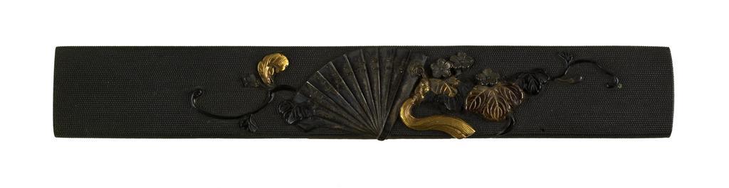 | Keywords: Japanese - Kozuka with Fan and Vine - Walters 51849.jpg An open fan is in the middle of the kozuka surrounded by flowers and vines The background is in an extremely fine fish egg pattern nanako-ji century 19 Edo shakudo gold silver copper cm 9 6 l accession number 51 849 2916 William T / Henry Walters Collection Baltimore date and mode of acquisition unknown Walters Art Museum Henry Walters Acquired by William T or Henry Walters none sticker - red trellis border Japanese numbers 2 9 place of origin Japan Walters Art Museum license Kozuka in the Walters Art Museum Media contributed by the Walters Art Museum needs category review |
