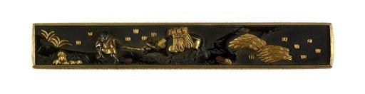 Keywords: Japanese - Kozuka with A Man Leading an Ox with Sheaves of Rice - Walters 51867.jpg This kozuka shows an agricultural scene with a farmer leading an ox The oxen is carrying sheaves of newly cut rice On either side of the ox are rice patties with stumps of the cut rice date shakudo gold copper cm 9 5 accession number 51 867 7153 Henry Walters Baltimore date and mode of acquisition unknown Walters Art Museum Henry Walters Acquired by Henry Walters none place of origin Japan Walters Art Museum license Tosogu Japanese sword fittings in the Walters Art Museum Media contributed by the Walters Art Museum needs category review |