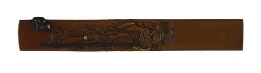 Keywords: Japanese - Kozuka with the Taoist Immortal Gama and His Toad - Walters 51690.jpg The man shown resting on his walking stick is the Taoist immortal Gama At the bottom is a three-legged frog Gama's spirit was able to leave his body to wander and once returned to find the body unfit to reinhabit He put his spirit into the nearest creature which was a frog century 19 Edo-Meiji copper shibuichi and gold cm 9 8 accession number 51 690 14600 Henry Walters Baltimore date and mode of acquisition unknown Walters Art Museum Henry Walters Acquired by Henry Walters none place of origin Japan Walters Art Museum license Kozuka in the Walters Art Museum Media contributed by the Walters Art Museum needs category review