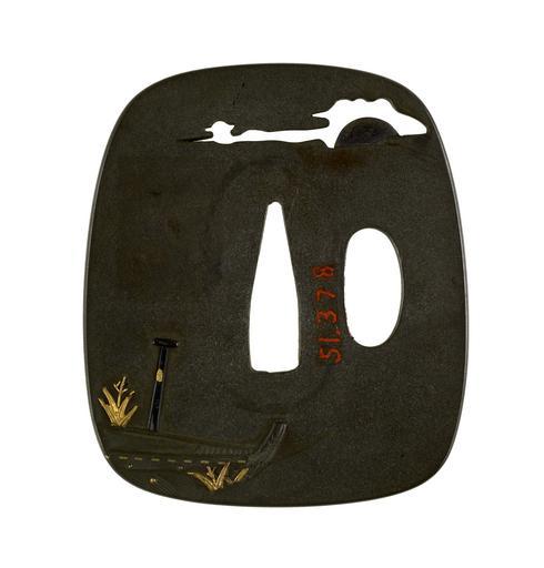 | Keywords: Japanese - Tsuba with a Cormorant Fisherman - Walters 51378 - Back.jpg The man at the right holds a large ladle upon which a cormorant bird is perched He holds a lease for the bird in his right hand Cormorants were traditionally used to catch fish in rivers in some parts of Japan A ring was tied around the bird's neck to prevent it from swallowing the fish it caught The moon in clouds at the upper left of the tsuba indicates that this is night time when cormorants were used for fishing On the reverse is a boat at a river bank date shibuichi gold copper cm 6 7 accession number 51 378 12777 Henry Walters Baltimore date and mode of acquisition unknown Walters Art Museum Henry Walters Acquired by Henry Walters none place of origin Japan Walters Art Museum license Tsuba in the Walters Art Museum Media contributed by the Walters Art Museum needs category review |