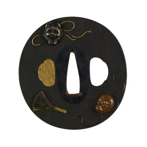 | Keywords: Japanese - Tsuba with Five Noh Masks - Walters 51348.jpg The five masks shown on this tsuba are used by performers in noh drama At the upper right is the Okina mask used for specific types of old men At the lower right is the Ko-omote mask used for beautiful young women The mask at the lower left is the O-beshimi mask used for demons On the reverse the mask as the upper left is the Hannya mask of a jealous woman who has turned into a demon The Hiottoko mask at the lower right is often used for comic male characters A fan is at the lower left date shakudo gold silver copper shibuichi cm 7 1 6 78 0 46 accession number 51 348 17684 Henry Walters Baltimore date and mode of acquisition unknown Walters Art Museum Henry Walters Acquired by Henry Walters none place of origin Japan Walters Art Museum license Tsuba in the Walters Art Museum Media contributed by the Walters Art Museum needs category review |