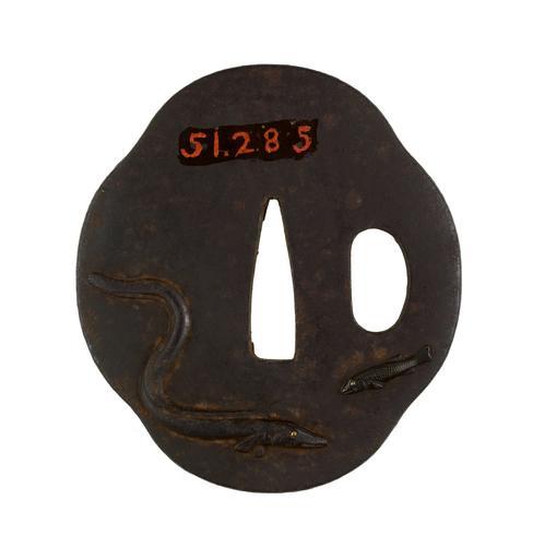 | Keywords: Japanese - Tsuba with Sea Creatures - Eel, Flying Fish, Spiny Lobster, and Octopus - Walters 51285 - Back.jpg Various sea creatures crafted in different metal alloys are depicted on this tsuba Along the upper right edge is a spiny lobster which is often used as a symbol of longevity At the lower right is a flying fish An octopus occupies the lower left On the reverse are an eel and another fish along the lower edge date iron copper gold silver shakudo cm 6 33 5 69 0 55 accession number 51 285 32756 Henry Walters Baltimore date and mode of acquisition unknown Walters Art Museum Henry Walters Acquired by Henry Walters none place of origin Japan Walters Art Museum license Tsuba in the Walters Art Museum Media contributed by the Walters Art Museum needs category review |