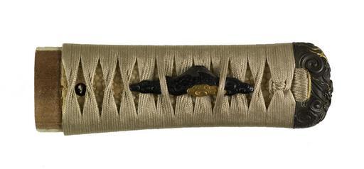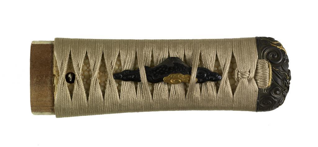 Keywords: Japanese - Tsuka with Dragons, Clouds, and Mt Fuji - Walters 5112813B - Back.jpg The kashira on the end depicts a dragon amongst clouds with gold highlights One of the menuki is in the shape of a gold dragon flying through shakudo clouds The other depicts Mt Fuji The pairing of a dragon and Mt Fuji is an emblem of success This is part of a mounted set century 18 19 late Edo-Meiji silver ray skin gold shakudo cm 12 2 accession number 51 1281 3B 2350 Henry Walters Baltimore date and mode of acquisition unknown Walters Art Museum Henry Walters Acquired by Henry Walters none place of origin Japan Walters Art Museum license Tsuka in the Walters Art Museum Media contributed by the Walters Art Museum needs category review Media contributed by the Walters Art Museum needs artist review |