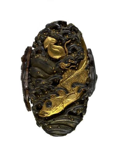 Keywords: Japanese - Tsuka with Fish and Flowers - Walters 5112643B - Detail A.jpg The kashira and menuki depict various fish Both menuki are in the shape of carp On the top of the kashira a carp and a squid are shown Puffer fish are on either side of the kashira The tsuka is decorated with roundels of flowers including plum vines bush clover and iris This is part of a mounted set in which the tsuba fuchi kozuka and kogai are all signed by Ômori Hidetomo between 1742 1807 Edo black lacquer silver gold shakudo copper cm 23 8 accession number 51 1264 3B 79262 William T / Henry Walters Collection Baltimore date and mode of acquisition unknown Walters Art Museum Henry Walters Acquired by William T or Henry Walters none place of origin Sendai Japan Walters Art Museum license Tsuka in the Walters Art Museum Media contributed by the Walters Art Museum needs category review Ă”mori Hidetomo