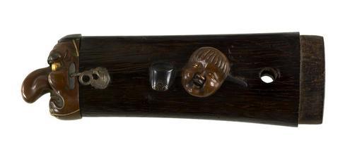 Keywords: Japanese - Tsuka with Masks - Walters 5111873B - Back.jpg Three masks probably for use in comic plays kyôgen are shown on this tsuka The kashira is a long-nosed tengu demon mask The menuki are masks for sake-loving shôjô Behind each mask is a sake ladle This is part of a mounted set century 19 Edo-Meiji black lacquer stained wood copper alloy silver gold cm 11 9 accession number 51 1187 3B 79341 William T / Henry Walters Collection Baltimore date and mode of acquisition unknown Walters Art Museum Henry Walters Acquired by William T or Henry Walters none place of origin Japan Walters Art Museum license Tsuka in the Walters Art Museum Media contributed by the Walters Art Museum needs category review |