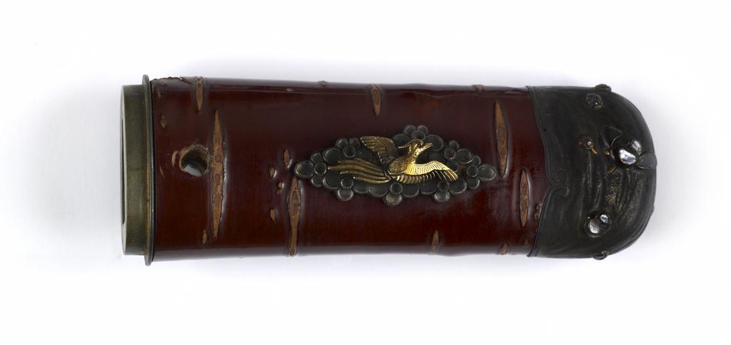 Keywords: Japanese - Tsuka with Plum Blossoms and Phoenixes - Walters 5111612 - Back.jpg The background of this tsuka is designed to look like the bark of a tree The menuki on either side depict a mythical phoenix-like bird hô-ô flying over a group of flowers The kashira on the end is decorated with carved plum blossoms This is part of a mounted set century 19 Edo silver gold wood cm 11 accession number 51 1161 2 14945 William T / Henry Walters Collection Baltimore date and mode of acquisition unknown Walters Art Museum Henry Walters Acquired by William T or Henry Walters none place of origin Japan Walters Art Museum license Tsuka in the Walters Art Museum Media contributed by the Walters Art Museum needs category review