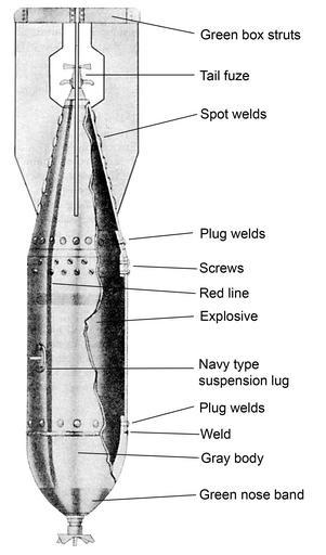| Keywords: Japanese Type 98 No 25 land bomb.jpg A diagram of a Japanese Navy World War II Type 98 No 25 532 lbs Land bomb Diagram scanned from TM 9-1985-4 Japanese Explosive Ordnance Before March 1953 US Gov Public domain - US gov PD-USGov Japanese WW2 Air-dropped bombs Weapons of the Imperial Japanese Army |