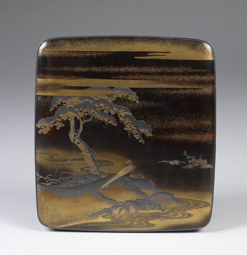 | Keywords: Japanese - Writing Box and Implements (suzuri bako) with a Pheasant Beside a Stream - Walters 6775 - Top.jpg Implements inside the box A rectangular inkstone with a depression for water is positioned in the center of the box On the right side are brushes and a stylus while on left is an encased knife used to cut paper The enamel piece above in the shape of hollyhock leaves is a water-dropper An ink stick sumi would have been included in the set The sumi is a small stick of solid ink that is turned into usable ink by grinding it on the inkstone and adding water Lid with pheasant beside a stream The inlaid silver Japanese text on the lid is a partial line from a poem in Lady Murasaki Shikibu's early 11th-century novel The Tale of Genji In chapter 29 The Royal Outing the emperor invites Genji to go hunting in the mountains outside Kyoto Genji sends his regrets that he cannot join the royal party The emperor decides to send Genji a couple of pheasants with the following poem attached Deep in the snows of Mount Oshio Are ancient pheasants' tracks Would that you might see them The box makes a poignant reference to this classical poem as it holds the tools of a poet century 18 19 Edo; Meiji box wood lacquer silver mother-of-pearl gold; paint brushes wood lacquer animal hair; water dropper silver enamel; stylus wood lacquer steel; knife wood lacquer steel; ink stone slate Lid cm 2 54 21 27 22 86 ; Bottom cm 3 81 21 27 22 86 accession number 67 75 21270 Henry Walters Baltimore date and mode of acquisition unknown Walters Art Museum Henry Walters Acquired by Henry Walters Japanese Lacquers The Walters Art Gallery Baltimore 1984 place of origin Japan Walters Art Museum license Art of Japan in the Walters Art Museum Suzuri bako Writing boxes |
