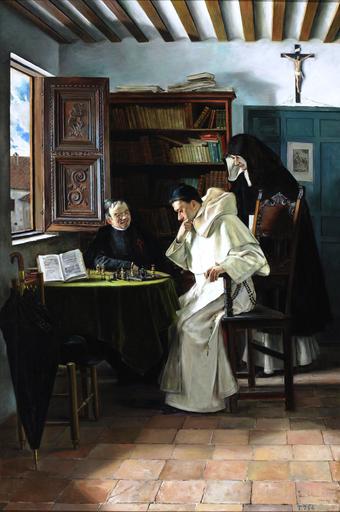 Keywords: Jaque mate, de Joaquín María Herrer y Rodríguez (Museo del Prado).jpg La obra representa una partida de ajedrez y a un religioso de la Orden de Santiago cuya cruz roja lleva bordada al pecho dando jaque mate a otro fraile y en presencia de un tercero 1887 oil on canvas Size cm 98 148 Institution Museo del Prado Depositado en la Fiscalía General del Estado Madrid https //www museodelprado es/coleccion/obra-de-arte/jaque-mate/35110f17-3a0b-4f53-bf89-96c882d403a7 accession number P04837 https //content3 cdnprado net/imagenes/Documentos/imgsem/35/3511/35110f17-3a0b-4f53-bf89-96c882d403a7/139f3ece-7f04-40bc-ba2b-49fa4ca44f12 jpg PD-old-100 Chess players in art Joaquín María Herrer y Rodríguez Spanish 19th-century paintings in the Museo del Prado Paintings in the Fiscalía General del Estado Madrid 1887 paintings in Spain |