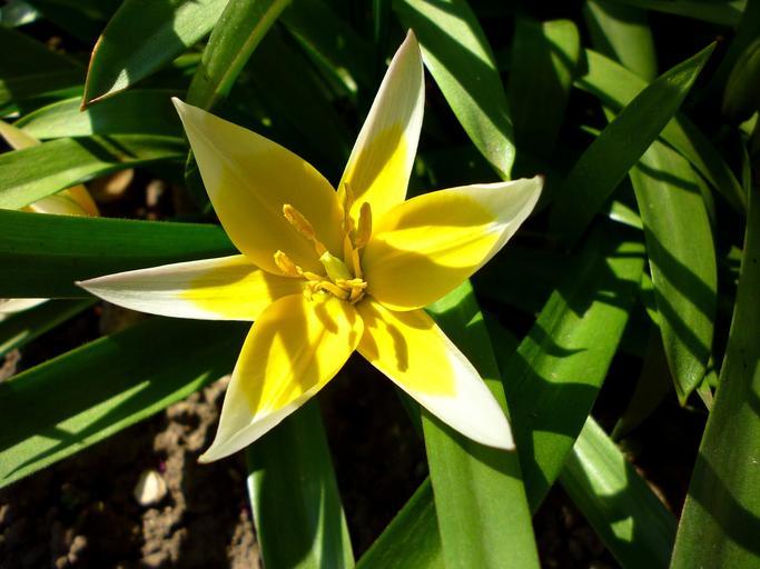 Keywords: jardin des plantes two color tulip sunlight green leaf spring march yellow white flower