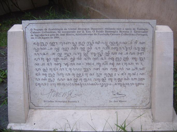 Keywords: Javanese script01.jpg en Javanese_script at the en Water Palace en Jogjakarta - bilingual Portuguese / Javanese Own 2007-11 Vberger Files by User Vberger Javanese script Portuguese language Bilingual plaques Calouste Gulbenkian