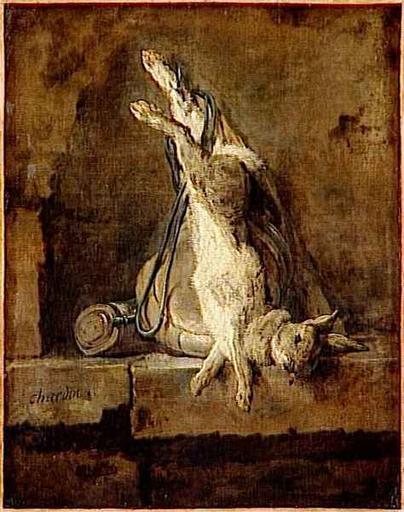 | Keywords: Jean-Baptiste Siméon Chardin - Lapin mort et attirail de chasse.jpg Painting Creator Jean Siméon Chardin c 1727 Oil on canvas cm 81 65 Institution Louvre own user Rlbberlin other versions PD-old-100 Still life paintings by Jean Siméon Chardin 1727 French paintings in the Louvre - Room 39 1720s paintings in the Louvre 1727 oil on canvas paintings in France 1720s still life paintings 18th-century still life paintings in France Dead hares in art Still life paintings of dead game Paintings by Chardin in the Louvre |