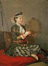 Keywords: Jean-Étienne Liotard - Turkish Woman with a Tambourine - WGA13067.jpg Artwork Creator Jean-Étienne Liotard between 1738 1743 Oil on canvas size cm 64 49 Institution Musée d'Art et d'Histoire Geneva object history credit line accession number WGA link 13067 http //www wga hu/art/l/liotard/turkish jpg http //www wga hu/html/l/liotard/turkish html PD-old-100 painting genre Swiss 1701-1750 WGA form painting WGA type genre WGA School Swiss WGA time period 1701-1750 Paintings by Jean-Étienne Liotard Portrait paintings in the Musée d'Art et d'Histoire Geneva 18th-century oil paintings of sitting women at full length Divans furniture 1740c Tambourines in art |
