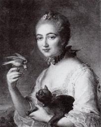 Keywords: Jean-Frédéric-Marc Nattier, Portrait de jeune femme au chat et à l'oiseau (1753).jpg Artwork creator Jean-Frédéric-Marc Nattier portrait of female 1753 Oil on canvas cm 64 5 53 5 Institution unknown object history credit line Nattier fils p x 1753 signature / date bottom left ~ full form accession number http //pics livejournal com/latiaris/pic/0002cwfz other versions PD-old-100 DEFAULTSORT 1753; unknown woman Jean-Frédéric-Marc Nattier 18th-century portrait paintings location missing 18th-century portrait paintings of unidentified women 1753 oil on canvas paintings Portrait 1753 portrait paintings from France 18th-century oil portraits of women at half length 18th-century portrait paintings with birds 18th-century portrait paintings with cats Animal bells Black and white reproductions of portrait paintings in color Eye contact in art Female hair fashion in art Females with chokers in art Portrait paintings of women of France Portrait paintings of women with birds Portrait paintings of women with cats Portraits with sky background Powdered hair in art Rococo portrait paintings of women Robe à la française Three-quarter view painted portraits of women facing left |