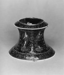 Keywords: Jean Limosin II - Salt Cellar - The Muses - Walters 44360.jpg The concave hexagonal body flares into a molded circular base In the receptacle saleron is delineated a female bust in profile to the right against a black background powdered with gilt dots She wears a costume with square neckline showing the frill of the underdress and a blue bonnet encircled with a wreath of laurel The molded rim is decorated with scrolls Each of the six concave panels on the sides displays a full-length figure of a Muse playing a musical instrument One is following the notes on a score with her left forefinger The figures stand on basin-shaped podia supported by brackets of foliage and beneath canopies with lambrequins Vines twisted around gilt rods separate the panels The convex base is decorated with foliate scrolls animated by parrots The underside is enameled in black powdered with fleurs-de-lys quatrefoils and dots of gold On the panel representing the Muse playing the guitar is lettered in gold the signature I L with a fleur-de-lys painted faintly between the two initials The shape of the salt cellar a piédouche with hexagonal body appeared in metalwork towards the end of the 16th century Such enameled salt cellars were executed in pairs 1st quarter 17th century technique painted enamel copper cm 10 14 accession number 44 360 25558 William Cosier date and mode of acquisition unknown Sale Christie's London April 5 1894 no 106 Charles Borradaile Brighton date of acquisition unknown by purchase George Robinson Harding London date of acquisition unknown by purchase Henry Walters Baltimore date of acquisition unknown by purchase Walters Art Museum Henry Walters Acquired by Henry Walters place of origin Limoges France Walters Art Museum license Limoges painted enamels in the Walters Art Museum Media contributed by the Walters Art Museum needs category review Media contributed by the Walters Art Museum needs artist review Painted enamel art in the Walters Art Museum Muses |