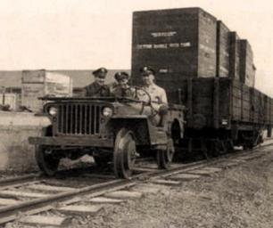 Keywords: Jeep switcher with flatbed trailer (cropped).jpg en Jeep used by soldiers during a test run on a 1 meter narrow gauge track in Brisbane Australia on 30 June 1943 A ¼ ton jeep fitted with rail wheels can easily pull 20 000 pounds The main purpose of these rail jeeps was to haul flatcars loaded with supplies in New Guinea This demonstration was held at Eagle Farm Aerodrome in Brisbane Australia At the wheel is Brig Gen C W Connell Commanding General Air Service Command To his right are LTC Donald Thomas Boise Idaho and LTC R L Fry Pocatello Idaho Brisbane Australia 30 June 1943 See http //www team-bhp com/forum/attachments/4x4-vehicles/108924d1236364355-willys-mb-ford-gpw-meter-gauge-tracks-willysmb001 jpg www team-bhp com/ de Demonstration auf einer Schmalspurbahn mit 1000 mm Spurweite im Eagle Farm Aerodrome in Brisbane Australien am 30 Juni 1943 durch amerikanische Soldaten Der 250 kg schwere Jeep auf Eisenbahnrädern konnte leicht eine Last von 10 Tonnen ziehen was für den Einsatz in Neuguinea geplant war http //cs trains com/ctr/f/3/t/186941 aspx http //cs trains com/ Posted by http //cs trains com/members/wanswheel/default aspx wanswheel on Tuesday February 08 2011 7 50 PM 1943-06-30 PD-Australia thumb left Jeepomotive with flatbed trailer PD-USGov-Military-Army Willys MB / Ford GPW Australia in World War II Rail transport in Brisbane Rail Jeep |