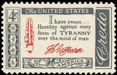 Keywords: Jefferson quote.jpg en US Postage stamp depicting Jefferson quote 2012-08-19 U S Post Office / Smithsonian Postal Museum Bureau of Engraving and Printing; Imaging by Gwillhickers PD-USGov Uploaded with UploadWizard History of the United States on stamps Stamps of the United States 1951-1960 Commemorative stamps of the United States |