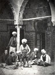 Keywords: Jerusalem cafe du rue 1858.jpg arab men smoking pipe and drinking turkish coffee in a coffee shop corner in jerusalem E Pierotti works 1858 E Pierotti PD Old PD-old Historical images of Jerusalem 1858 1858 People of Palestine Cafés in Jerusalem Cuisine of Jerusalem