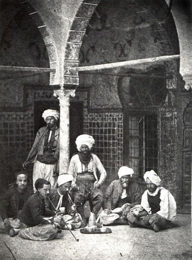 MAKE A MEME View Large Image Jerusalem cafe du rue 1858.jpg arab men smoking pipe and drinking turkish coffee in a coffee shop corner in jerusalem E Pierotti works 1858 E Pierotti PD Old PD-old Historical images of Jerusalem 1858 1858 People of Palestine Cafés in ...