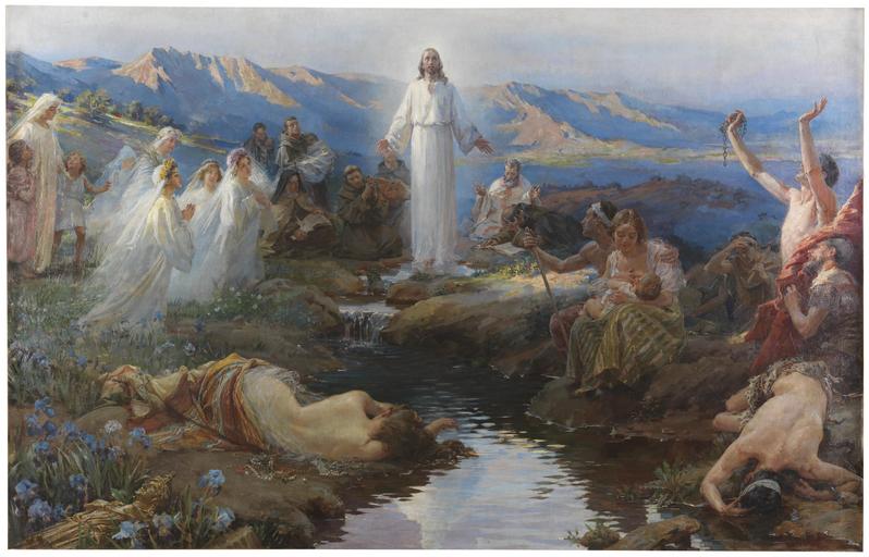 | Keywords: Jesús, manantial de amor (Museo del Prado).jpg El lienzo muestra a Jesucristo del que brota una fuente de agua como manantial de amor ~ 1900 oil canvas Size cm 301 193 Institution Museo del Prado Depositado en el Museo Garnelo de Montilla provincia de Córdoba España https //www museodelprado es/coleccion/obra-de-arte/jesus-manantial-de-amor/f00c2c8f-d2c6-4d79-a4fb-d2139578a446 object history exhibition history credit line accession number P06987 https //content1 museodelprado es/imagenes/Documentos/imgsem/f0/f00c/f00c2c8f-d2c6-4d79-a4fb-d2139578a446/28db7e10-8a43-4441-91fa-e193f1007e40 jpg PD-old-100 Allegories of Christ Paintings of Jesus Christ in Spain Spanish 20th-century paintings in the Museo del Prado José Garnelo y Alda |