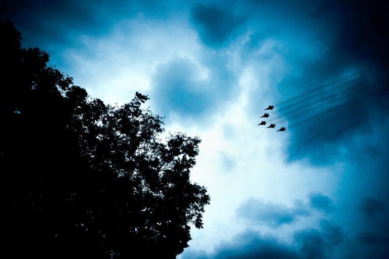 Keywords: jet planes contrails sky clouds night evening trees silhouette dark blue