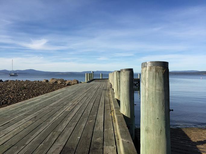 Keywords: jetty dock water pier wood sky blue peaceful rocks wooden shore