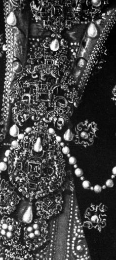 | Keywords: Jewelry of Anne of Austria.jpg Jewelry of Anne of Austria 1573-1598 Biżuteria Anny Austriaczki 1573-1598 author < 1595 Gold pearls diamonds enamel Current whereabouts unknown Detail of a portrait of Queen Anne of Austria by Martin Kober Ilustrowany Kurier Codzienny Illustrated Daily Courier 1934 PD-Art PD-old-100 Jewels from the Polish Vasa Collection 17th-century jewellery |
