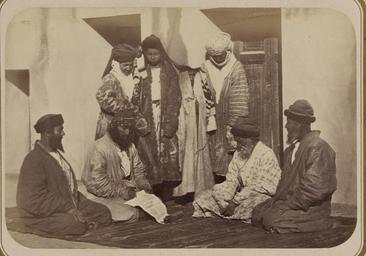 | Keywords: Jewish Wedding Rituals. Two Men Representing the Families of the Bride and Groom Finalizing the Wedding Agreement WDL10711.png Artwork ru Кун Александ Людвигович 1840 1888 гг fr Kun Aleksandr L 1840-1888 en Kun Aleksandr L 1840-1888 zh 亚历山大·L· ,1840-1888 年 pt Kun Aleksandr L 1840-1888 ar كُن، ألكسندر ل ، 1840-1888 es Kun Aleksandr L 1840-1888 ru Ев ейские свадебные об яды Двое мужчин п едставляющих семьи жениха и невесты заключают свадебный догово fr Rituels de mariage juifs Deux hommes représentant les familles des fiancés finalisant le contrat de mariage en Jewish Wedding Rituals Two Men Representing the Families of the Bride and Groom Finalizing the Wedding Agreement zh 犹太人的婚礼仪式 两位男 代表新娘和新郎的家人签订婚约 pt Rituais de casamento dos judeus Dois homens que representam as famílias do noivo e da noiva finalizando o contrato de casamento ar طقوس الزفاف اليهودي وكيلا أسرتي العروس والعريس يُجريان عقد الزواج ru Эта фотог афия входит в этног афическую часть <em> Ту кестанского альбома </em><em></em> всесто оннего исследования Цент альной Азии п едп инятого после того как в 1860-х годах в егионе установилось господство Российской импе ии Альбом созданный по аспо яжению гене ала Константина Пет овича фон Кауфмана 1818 1882 годы пе вого гене ал-губе нато а оссийского Ту кестана состоит из четы ех частей в шести томах «Часть а хеологическая» два тома «Часть этног афическая» два тома «Часть п омысловая» один том и «Часть исто ическая» один том Основным составителем альбома был оссийский востоковед Александ Людвигович Кун аботавший совместно с иколаем Венедиктовичем Богаевским В альбоме п едставлено около 1200 фотог афий а также а хитекту ные планы аква ельные исунки и ка ты «Часть этног афическая» включает в себя 491отдельную фотог афию на 163 листах а фотог афиях изоб ажены п едставители азличных на одов егиона листы 1 33 повседневная жизнь и итуалы листы 34 91 а также виды де евень и го одов уличные то говцы и комме ческая деятельность листы 92 163 <br>Этног афические фотог афии; Г упповые по т еты; Ев еи; авы и обычаи; Фотог афические исследования; По т етные фотог афии; Свадьбы fr Cette photographie est extraite de la partie ethnographique de l'<em>Album du Turkestan</em> étude visuelle complète de l'Asie centrale entreprise après que l'Empire russe prit le contrôle de la région dans les années 1860 Commandé par le général Konstantin Petrovich von Kaufman 1818 1882 premier gouverneur général du Turkestan russe l'album est composé de six volumes en quatre parties la partie archéologique deux volumes la partie ethnologique deux volumes la partie sur les métiers un volume et la partie historique un volume L'album fut essentiellement compilé par l'orientaliste russe Aleksandr L Kun assisté de Nikolai V Bogaevskii Il comporte près de 1200 photographies et inclut également des plans architecturaux des dessins à l'aquarelle et des cartes La partie ethnographique compte 491 photographies sur 163 planches montrant des individus des différentes peuplades de la région planches 1 à 33 des scènes de la vie quotidienne et des rites planches 34 à 91 ainsi que des vues de villages et de villes de vendeurs ambulants et d'activités commerciales planches 92 à 163 <br>Photographies ethnographiques; Portraits de groupe; Juifs; Mœurs et coutumes; Inventaires photographiques; Portraits photographiques; Noces en This photograph is from the ethnographical part of <em>Turkestan Album</em><em> </em>a comprehensive visual survey of Central Asia undertaken after imperial Russia assumed control of the region in the 1860s Commissioned by General Konstantin Petrovich von Kaufman 1818 82 the first governor-general of Russian Turkestan the album is in four parts spanning six volumes Archaeological Part two volumes ; Ethnographic Part two volumes ; Trades Part one volume ; and Historical Part one volume The principal compiler was Russian Orientalist Aleksandr L Kun who was assisted by Nikolai V Bogaevskii The album contains some 1 200 photographs along with architectural plans watercolor drawings and maps The Ethnographic Part includes 491 individual photographs on 163 plates The photographs show individuals representing the different peoples of the region Plates 1 33 ; daily life and rituals Plates 34 91 ; and views of villages and cities street vendors and commercial activities Plates 92 163 <br>Ethnographic photographs; Group portraits; Jews; Manners and customs; Photographic surveys; Portrait photographs; Weddings zh 这张照片出自<em> 其斯 相册 </em>的民族部分,该相册是俄罗斯 国 19 世纪 60 年代取得中亚控制 后, 手制 的 部针对该 区的综合 图像调查记录 相册由俄罗斯驻 其斯 (俄罗斯 国中亚属 的名称)首任 康斯 丁·彼得罗维奇·凡· 夫曼(Konstantin Petrovich von Kaufman,1818 