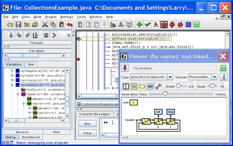 Keywords: JGRASP screenshot.png en jGRASP screenshot showing CSD and a linked list debugger viewer Own Labarowski 2009-04-23 Screenshots of software