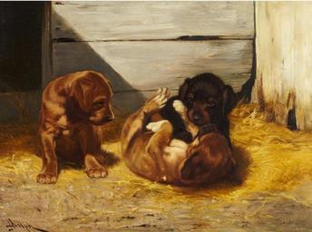 Keywords: JH Dolph Puppies in a Barn.jpg Artwork oil on canvas Size in 18 25 24 object history exhibition history credit line accession number http //www waddingtons ca/auctions/2012/12-11-intl/ w_i_id 82405 w_item_depth 6 w_keyword Waddingtons PD-art-100 John Henry Dolph 19th-century paintings of dogs |