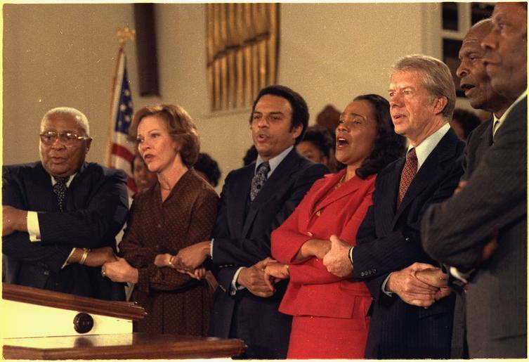 Keywords: Jimmy Carter and Rosalynn Carter sing with Martin Luther King, Sr., Coretta Scott King, Andrew Young and other civil... - NARA - 183007.tif Scope and content General notes 183007 Local identifier President 1977-1981 Carter White House Staff Photographers 01/20/1977 - 01/20/1981 Jimmy Carter Library NLJC 441 Freedom Parkway Atlanta GA 30307-1498 1979-01-14 Record group Collection JC-WHSP Carter White House Photographs Collection 01/20/1977 - 01/22/1981 Record group ARC 1120 Carter White House Photographs Presidential compiled 01/20/1977 - 01/22/1981 Series ARC 173341 File unit Jimmy Carter Rosalynn Carter - At the Ebenezer Baptist Church 01/14/1979 - 01/14/1979 File unit ARC 183006 Variant control numbers NAIL Control Number NLC-WHSP-C-08963-19 yes Other versions <gallery> File Coretta scott king ebenezer jpg File Martin Luther King Sr c1977-81 jpg </gallery> NARA-cooperation PD-USGov Andrew Young Coretta Scott King Martin Luther King Jr Rosalynn and Jimmy Carter |
