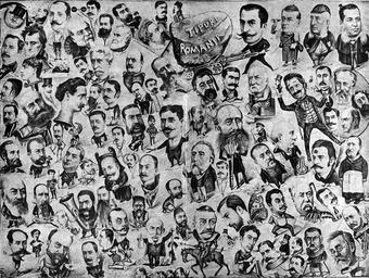 Keywords: Jiquidi - 100 tipuri din România.jpg 100 tipuri din România Pe partea stanga a planşei în rânduri dela stânga spre dreapta I - Grigore Ventura la pian - Dr G Asaki - Nicolae Velescu - Roco - Em Protopopescu - Pache şi Iancu Brătescu-Decalitru pe butoi II Dr George Stoicescu - Matei Millo - Mihail Cogâlniceanu curcan - Ion C Brătianu - Titu Maiorescu III Aristița Romanescu - Ciru Economu - - Dumitru C Brătianu - - Hitrovo IV - Gh din Moldova Kerembach - Principele Bibescu clopot - Andrei Popovici fabrica de spirt - Dr Victor Babeș - Nae Ulmeanu seful bătătușilor electorali ai liberalilor - C A Rosetti V Generalul George Manu - Ștefan Bellu - Dr Petrini Paul - Principele Dimitrie A Ghica - Beizadea Mitică pe un dovleac - Ion L Caragiale - Constantin Nacu - Alexandru Lahovary banditul Licisnski și Dr Petrini-Galați VI Petrache Grădișteanu - Theodor Sperantia - Grigore Manolescu în Hamlet -- Dr N Kalenderu - arhitect Ion Mincu - Grigore Brătianu - Radu Mihai și G Costaforu Adevârul VII Simeon Mihăilescu - Tudoriță Rosetti - generalul Ion Em Florescu floare'n ghiveciu - general Dr Demostene Cu trombonul - tipograful Iosef Göbl - Alexandru Marghlloman pe cal delemn Dr C Severeanu meșter lacatuș - Grigore Peucescu și I Popovici-Răcăciune VIII Tache Gianni - Ionică Fălcoianu cobzar - Laurian - - Constantin Nottara și Dr Felix eșind din canal Pe parted dreaptă a planșei in randuri dela stânga spre dreapta I Constantin Jicquidi autorul planșelor - Gr Alexandrescu - - Gheorghe Mârzescu II Niculache Gherassy prim-presedinte la Casație cu fustaneldă - Dr N Mdlddrescu Niculae Cămărășescu - Ștefan Iulian tatăl în Jupan din Voevodul Țiganilor - Sculptorul C Georgescu - iar pe paletă pictorii B Panaiteanu - Dumitru Mirea - Theodor Aman și Nicolae Grigorescu III Al V Beldiman Cu pana si Adevărul B P Hasdeu - - Vasile Alecsandri cu lyra IV Ion Ghica Luiggi Cazavillan Universul Ion Creangd Ion Slavici si Dr Râmniceanu V Ștefan Sihleanu în fluture - Papamihalopol - Lascăr Catargiu in rac - Georges Cosman ca sticlă de vin și Petre Poni VI Petre P Carp în Don Quichotte - Nicu Metz - Al Cantacuzino cel cu Azilul copiilor gasiți - C Olmazoglu moard de vânt - Popa Tache șeful bătăușilor electorali ai onservatorilor - Claymoor Mihail Văcărescu - - și V A Urechiă George Costescu Bucureştii vechiului regat Ed Universul 1941 Creator Constantin Jiquidi PD PD-old-100 Constantin Jiquidi Romania in the 19th century |