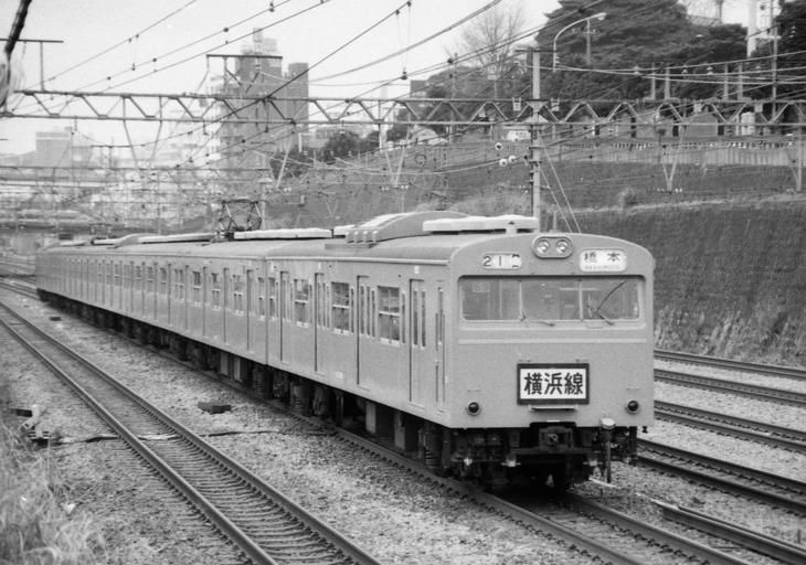 Keywords: JNR 103 Yokohama line.jpg en JNR 103 for Yokohama line taken at Keikyu Kanagawa station ja 横 線用103系 京 神奈 駅から撮影 1985-03 own Hahifuheho cc-zero Uploaded with UploadWizard 1985 in rail transport in Japan JNR 103 Yokohama Line Black and white photographs of Japan in the 1980s Black and white photographs of trains in Japan |