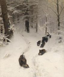 Keywords: Johann Christian Kröner Wildschweinrotte im Winterwald.jpg Wildschweinrotte im Winterwald signiert bezeichnet datiert Ch Kröner Düssdf 18 72 Öl auf Leinwand 95 x 80 cm http //www dorotheum com Dorotheum 1872 Johann Christian Kröner 1838-1911 PD-art-100 Images from Dorotheum Christian Kröner Boars in art Snow in art 1872 paintings |
